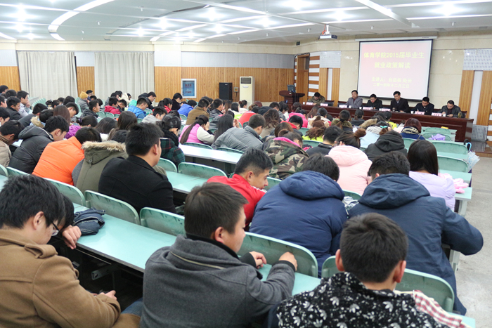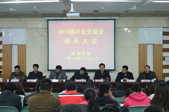 本网讯(文/唐增阳 摄/贺斌)12月3日下午,体育学院在圆形报告厅召开2015届毕业生就业动员大会。校学工部部长台启权、院党委书记袁德水,院长雷震,公司党委副书记黄德春,副院长钟晨,金涛,院长助理余涛教授出席了会议,学院2015届全体毕业生参加了大会。大会由公司党委副书记黄德春主持。