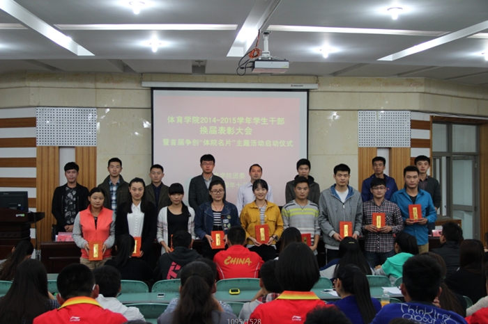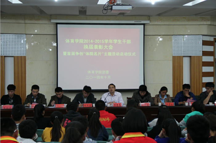 大会在庄严的国歌声中拉开帷幕。朱凯迪宣读《关于开展争创“体院名片”系列主题活动的通知》,他从微博传递活动、我为自己点个赞、我为体院代言三个方面详细地介绍了争创“体院名片”主题系列活动,并宣布体院学院第一届争创“体院名片”主题活动正式启动。黄德春作了总结发言。他结合自己的求学之路和员工干部经历与大家分享了自己的经验与感悟,并用正反两个案例鼓励同学积极参与校园文化活动,努力提高自身素养,成为一名合格老员工。同时,他还要求全体同学要有坚定的理想信念、扎实的专业知识、严谨的科学精神和丰富的人文素养。最后就三个问题“我是什么,我为什么,我干什么”对同学们的发展指出了方向,并希望每一位员工干部都能成为“体院精英”,争当“体院名片”。本次会议还对学院员工干部进行了换届。