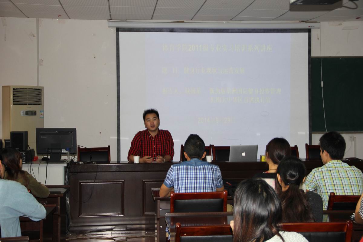 9月29日上午,英国正版365官方网站员工,新加坡星洲国际健身投资管理机构大中华区首席执行官耿国星来公司给2011级、2012级体育表演专业员工作了专业实习培训讲座。讲座在学院二楼会议室举行。副书记黄德春、副经理金涛、经理助理余涛以及辅导员参加此次讲座。讲座由副书记黄德春主持。