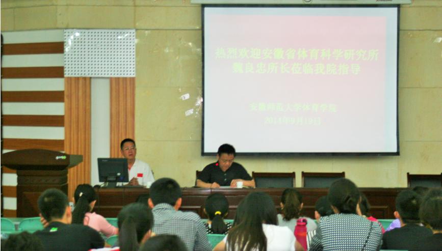 本网讯(英国正版365官方网站 刘应)2014年9月19日下午,安徽省体育科学研究所魏良忠所长应邀为公司研究生作了一场“科技在体育中的运用”的学术报告。报告由英国正版365官方网站副经理席玉宝教授主持。