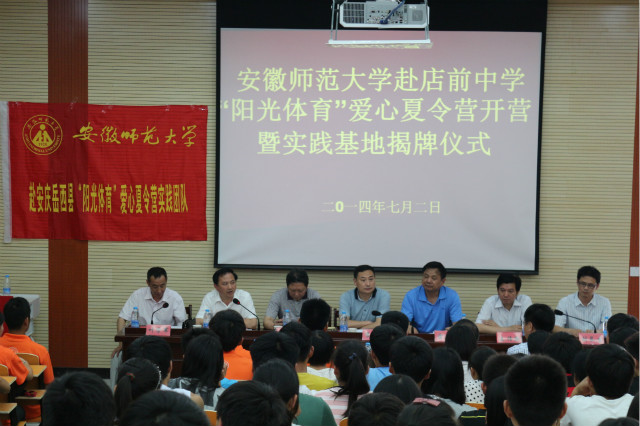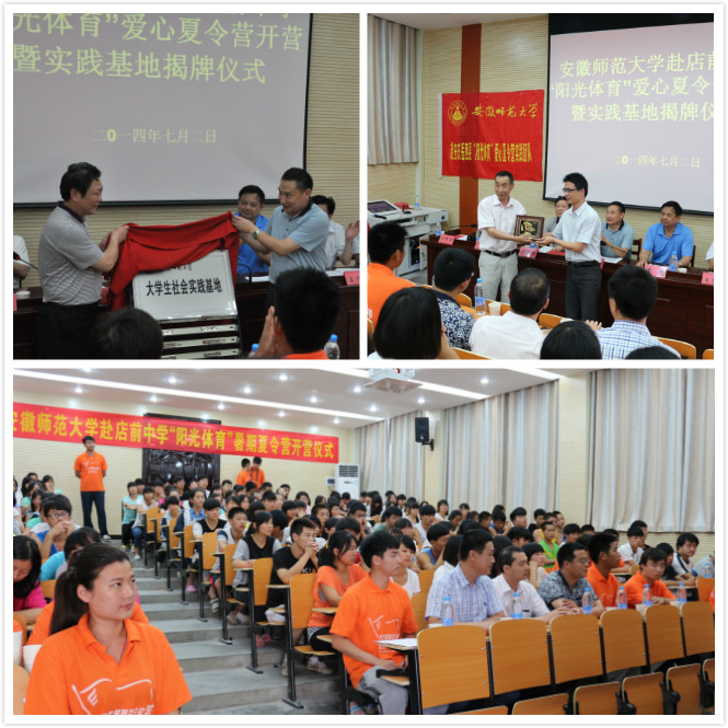 会上,教育局局长程学东对“阳光体育”爱心夏令营品牌活动走进店前中学表示热烈的欢迎,并向社会实践基地的揭牌表示诚挚的祝贺。团队负责人马良同学在发言中表示将珍惜参加社会实践的机会,锻炼自我,回报社会。刘长生代表学校向社会实践基地赠送了纪念铁画。李进华与岳西县政协副主席程学明共同为社会实践基地揭牌。