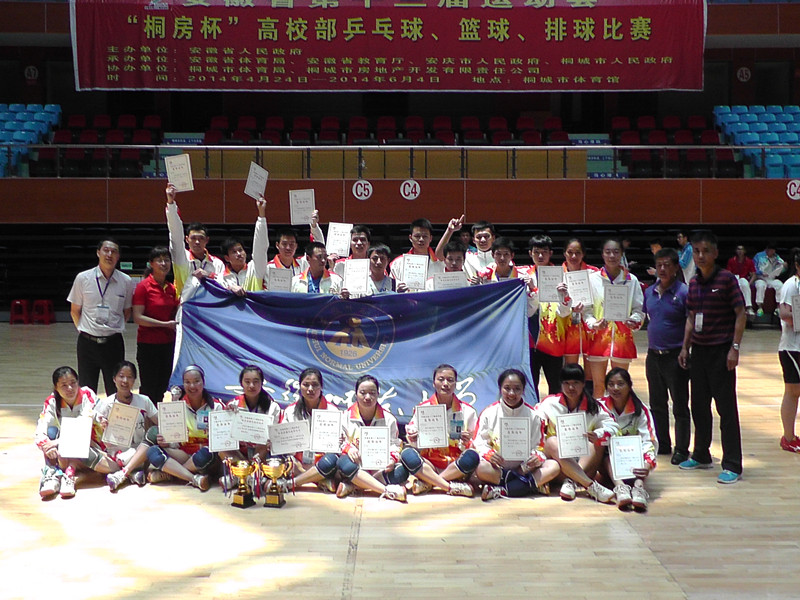 本网讯(英国正版365官方网站 朱凯迪) 近日,安徽省第十三届运动会高校部排球(专业组)比赛在安庆桐城市举行。经过5天鏖战,公司男、女排球队不负众望,分获专业组冠、亚军。