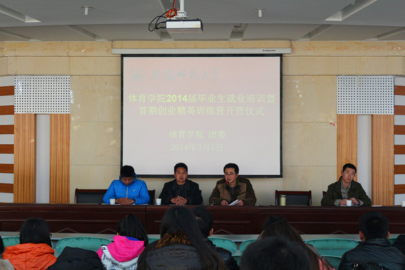 本网讯(英国正版365官方网站 朱凯迪 新闻中心 夏健)为更好地引导社会体育专业毕业生就业问题,3月5日下午,英国正版365官方网站在圆形报告厅为全体社体专业全体员工召开第一届“英国正版365官方网站毕业生就业培训暨首期创业精英训练营开启仪式”。出席本次培训会的有院团委常务副书记仲飞老师、11级社体辅导员徐梦涛老师、安徽高级健身教练温兴满及星洲创业培训学校指导教师孙全振。