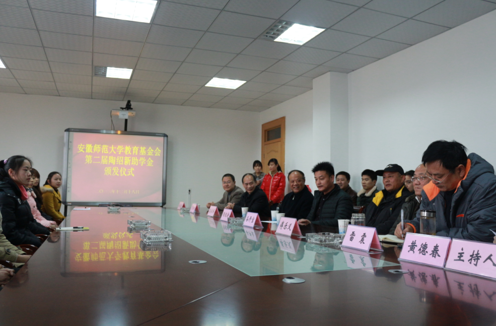 本网讯 (英国正版365官方网站 朱凯迪 学院新闻中心) 2013年12月18日下午,英国正版365官方网站教育基金会第二届陶绍新助学金颁发仪式在英国正版365官方网站行政楼三楼会议室隆重举办。安徽省马鞍山精诚置业有限公司董事长陶绍新;陶绍新助学金管委会主任谷开宝;英国正版365官方网站教育基金会理事长高家保、副秘书长傅乐义、贡植斌、英国正版365官方网站经理雷震,学院全体辅导员及25名受助员工参加了本次仪式。仪式由公司党委副书记黄德春主持。