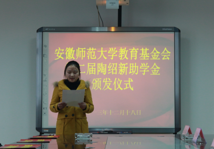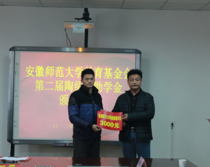 仪式开始由谷开宝老师宣读《关于向许晓东等25名同学颁发第二届陶绍新助学金的决定》。在大家热烈的掌声下,陶绍新董事长向今年受助的25名同学颁发助学金并激励大家好好学习,抱着感恩的心日后来回报母校。随后经理雷震在致辞中首先表达了对陶绍新董事长的欢迎与感谢,他向大家回顾了2012年首批受助28名员工受助后的学习生活情况,他们不仅在学习上取得了更加优异成绩,在其他各方面表现也一样出类拔萃。经理对本次受助员工寄予了厚望,希望同学们能合理使用助学金,要发扬自强不息,勇于奉献的精神,向陶绍新董事长学习,将感恩之情薪火相传。来自2010级体育教育专业的何静同学作为员工代表在向陶绍新董事长表达他们感谢的同时也表示在日后学习生活中一定会用自己的成绩来回报学校和社会的关爱。