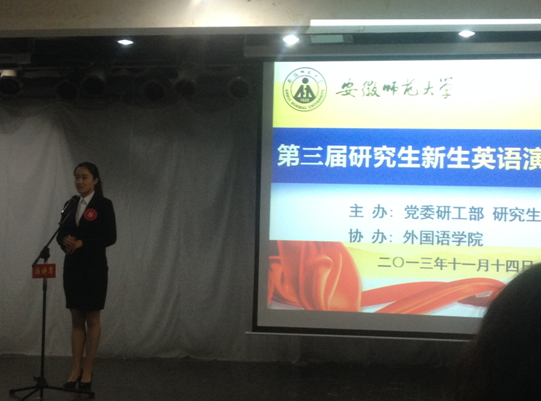 本网讯(英国正版365官方网站 新闻中心)2013年11月14日下午,由党委研工部、研究生学院主办、外国语学院协办的第三届研究生新生英语演讲比赛决赛在花津校区老员工活动中心多功能厅顺利举行。从各学院初赛中脱颖而出的16名研究生新生同场竞技,共同展示了公司研究生良好的英语应用能力和综合素质。