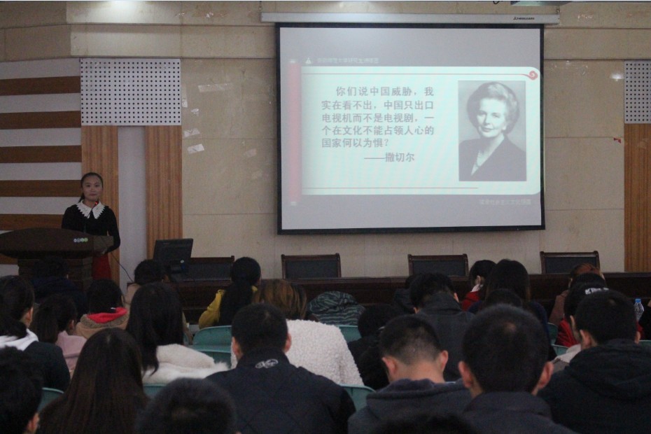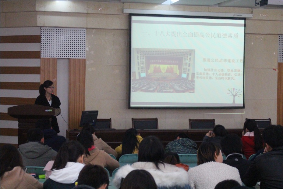 两位研究生学姐分别从文化建设、公民素质两个方面,为同学们依次做了“建设社会主义文化强国”、“争当美丽中国人”的主题宣讲。其中,段欣从十八大报告中建设社会主义文化强国切入,向同学们介绍了文化建设的战略地位、中国文化建设面临的挑战以及推进文化建设的举措,归纳出具有泱泱五千多年文明史的中华民族,之所以能生生不息、延绵不绝,关键在于中华文化的巨大凝聚力和向心力。随后,李蓉根据十八大提出的全面提高公民道德素质,指出了当前我国公民道德素质现状及其缘由,并向同学们介绍了应当如何提升公民素质,如何争做一名美丽中国人。二位宣讲人的宣讲各有特色、生动形象、图文并茂,赢得了在座学员们的阵阵掌声。