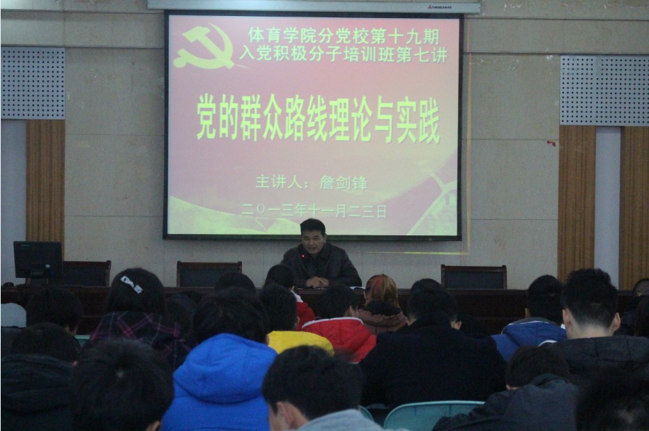詹剑锋结合党的建立及发展历程,沿着党的指导思想发展的历史脉络,向同学们深刻介绍了党的群众路线的形成与发展及其基本内涵。他指出,认真贯彻群众路线是保持党的先进性、纯洁性,巩固党的执政基础的必然要求,是解决群众反映强烈突出问题的必然要求。接着,詹剑锋结合典型贪腐官员刘青山、薄熙来等实例向在座学员们提出官僚主义、不思进取、道德败坏的种种弊端及后果。最后,他联系党的三大优良传统即理论联系实际、密切联系群众及批评与自我批评,建议入党积极分子们一定要不断增强对群众路线的认识,认真学习其理论知识,同时实践上要自觉做到以人为本,为民亲民。