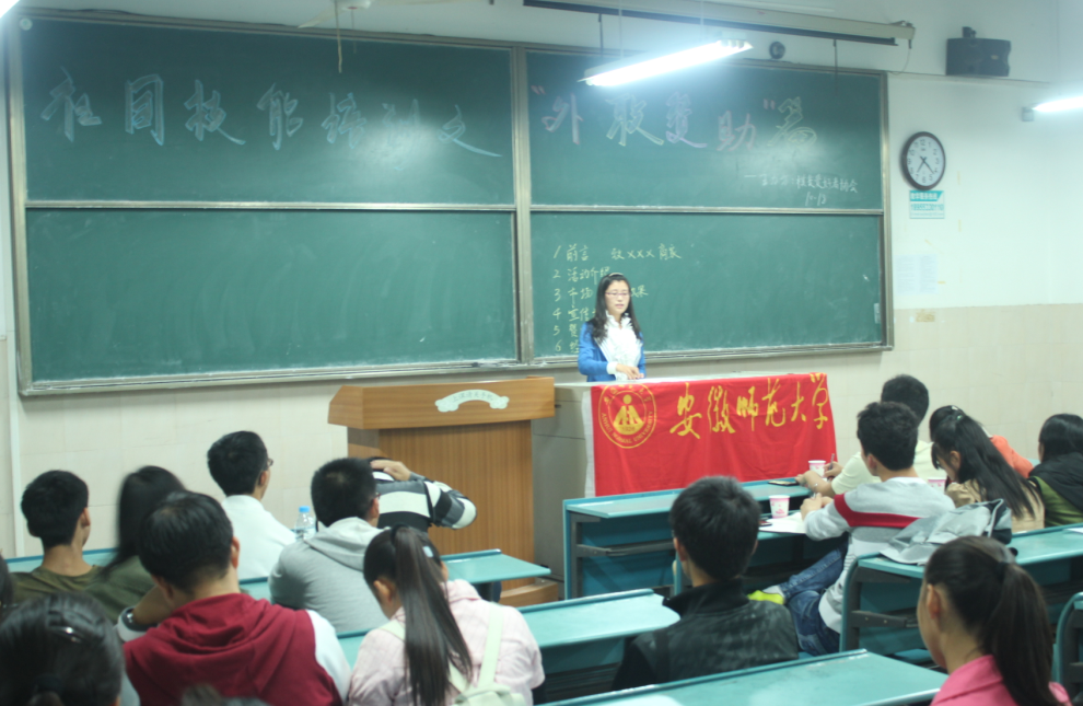 本网讯 2013年10月18日晚,英国正版365官方网站棋类协会、武术与舞蹈协会、球类协会共同开展社团技能培训系列活动——“外联赞助”篇。担任此次技能培训的主讲嘉宾为棋类协会会长马于棋、武术与舞蹈协会外联部部长万琴,三个社团的外联部理事以及相关会员参与培训。