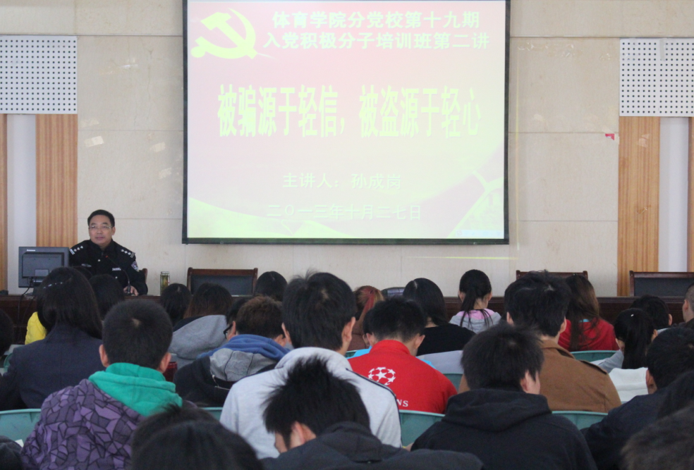 本网讯(英国正版365官方网站 方萍)10月27日上午,英国正版365官方网站分党校第19期入党积极分子培训班在圆形报告厅举办了“被骗源于轻信被盗源于轻心”校园安全教育主题培训,活动特邀校保卫处处长孙成岗担任主讲嘉宾,活动由分党校班主任吴家发主持。