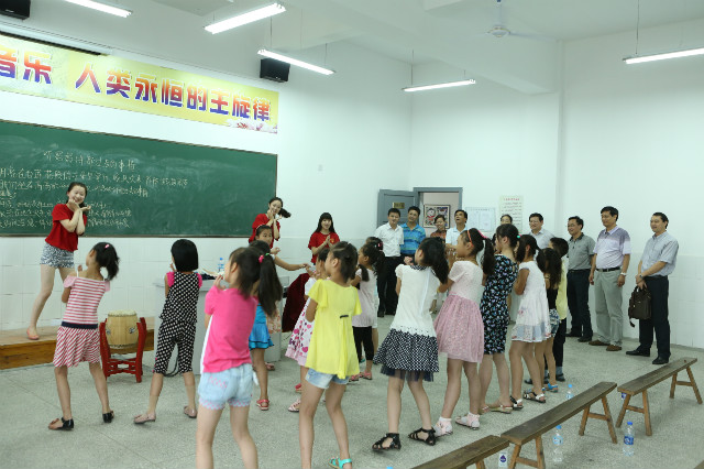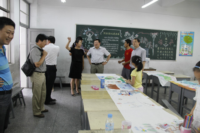 顾家山一行首先深入各个教学点兴致勃勃的观摩了“阳光体育”爱心夏令营授课活动,在学校操场,羽毛球、篮球、团体操、排球、乒乓球、田径等教学点,小营员们动作整齐划一,练习的有模有样,在主教学楼内,一批小营员们正在志愿者的带领下进行“红领巾相约中国梦”主题长卷绘画作品创作,在少年宫,音乐与舞蹈班的营员们载歌载舞,用歌声诉说着他们的快乐夏令营生活……顾家山一行看到志愿者开展丰富多彩的特色夏令营活动,感到非常欣慰,每到精彩之处都给予了热烈的掌声。