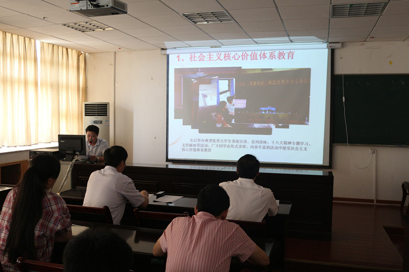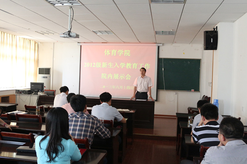 会议首先由2012级运训、体表专业辅导员陈实老师做展示汇报。陈老师就新生入学教育工作的14项内容逐一展示了自己的工作成果,其中关于三个课堂联动的具体运用,陈老师提出了自己的创新观点。接着,2012级体教专业两位辅导员蔡维敏老师、席特立老师也分别做了汇报。展示中,蔡老师策划的“每月电影秀”活动以及席老师提出的“乐学励志博学笃行”主题教育活动都得到与会老师的一致认可。
