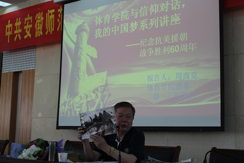 今年正好是抗美援朝战争胜利60周年,而周老先生就是朝鲜战争胜利的见证者。据了解,周老师十五岁参加革命,1951年到朝鲜进行了四年四年抗战,1955年回国。周老先生在演讲前拿出了他从朝鲜战场带来的背包等实物,让同学们亲眼目睹了他当年抗战时的点点滴滴。周老师告诉我们:“北大荒的冬季,气温经常在零下三四十度,草棚内结满了厚厚的白色冰霜,我们睡在地上铺的稻草上,棚顶和四周都是冰凌,就像睡在冰窖里一样。晚上大家穿着毛衣或棉衣睡觉,早上起来被子尤其是被头冻得梆梆硬,被子上面一层厚厚的白霜,头天晚上脱下来的棉胶鞋,这时已经冻得像一条扭曲的冻鱼。”