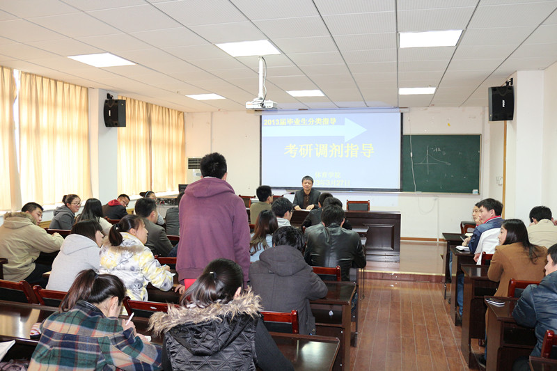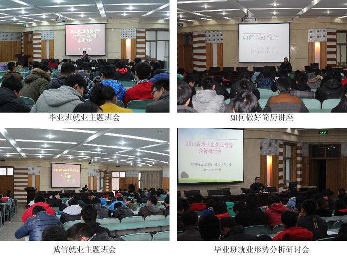 分类指导,毕业生就业服务有措施 为给毕业生提供更为深入、实际的指导,学院积极采取措施,加强就业指导服务工作。从毕业班一开始就组织开展了“就业形势分析研讨会”、“如何做好简历”、对员工实行全程化的就业教育,帮助毕业生解决思想困惑,树立正确的择业观和就业观。同时,针对本院毕业生四个主要出口:研究生、教师、公务员和自主创业,学院组织了分类系列指导:“考研复试培训”、“考研调剂指导”、“无生上课技巧”、“2013年考公政策解读”、“创业有风险,投资需谨慎”等专题指导。种种分类指导培训与交流对提高毕业生就业能力,增加就业砝码起到了积极作用。