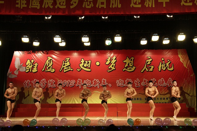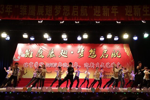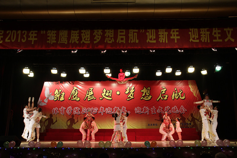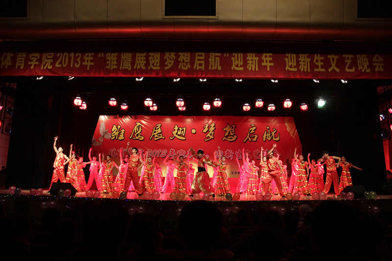 19时整,由院艺术团选送的舞蹈《幸福年又年》拉开整场晚会的大幕。优美的舞姿、动情的音乐从一开始就将整个会场推向了高潮。本场晚会节目形式多样,内容丰富:乐器演奏、秧歌、情景剧、舞蹈、歌曲、小品、健美表演、拉丁、跆拳道等,无不给观众带去了强烈的现场震撼力,同时也体现了公司学子多才多艺的一面。经理雷震老师口琴独奏的《义勇军进行曲》更是震撼人心,引来现场观众的高声欢呼。11体教选送的红遍全世界的《江南style》更是征服全场观众,博得阵阵喝彩;院社联选送的拉丁舞《梦幻狂想曲》的舞者们用肢体语言演绎出了青春的激情与浪漫;跆拳道队的跆拳道表演动作娴熟、强健有力;高难度的技巧啦啦操体现了体院学子过硬的专业技术,萨克斯、吉他等乐器以唯美的声音打动了在场每个人的心灵。何章明老师带领健美团队的表演更是引来现场观众的阵阵叫声,也将晚会推向另一个高潮。最后,由院大艺团选送的《炫》,用完美的舞姿为晚会的表演划上了句号。