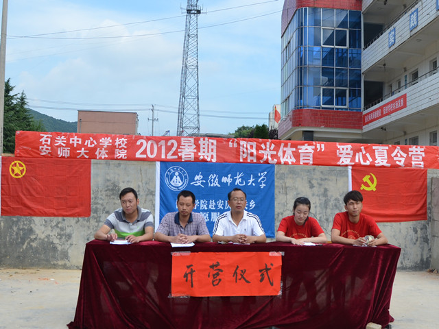 7月3日上午8时整,石关中学、师大体院2012年暑期“阳光体育”爱心夏令营开营仪式在石关中学操场举行。石关中学团委书记胡耀文、办公室主任黄灿、体育教师王吴为以及赴安庆实践团队的全体成员和石关中学的60多名员工参加了开营仪式。仪式上石关中学团委书记胡耀文表达了对安师大体院学子前往石关中学开展暑期实践活动的热烈欢迎。胡书记还表示,今年是师大体院首次在石关乡开展类似活动,校方将积极配合实践团队,为本次暑期实践和本校员工提供一个良好的平台。