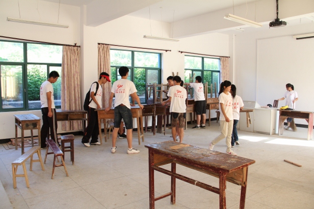 在经过简短休整后,团队相关负责人在与校方领导老师交涉的基础上立刻召开工作布置会议,就夏令营招生、各教学点实际教学安排、相关活动场地布置等方面展开热烈讨论,并于6日上午开始活动前期准备工作,在学校操场,志愿者们冒着近40度高温为各教学点布置场地器材,为了更好的配合纪念建团90周年主题教育活动,志愿者们专门准备了喷绘展板、黑板报、宣传横幅、投影电视等设施,此外,团队成员还积极与新华人民政府就“新农村建设杯”篮球赛相关事宜达成共识,队员们纷纷表示:将带着专业技能和志愿服务精神投入到即将开始的夏令营活动中去,并从中体会爱心与责任心的交融。