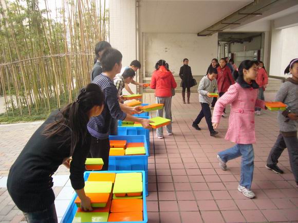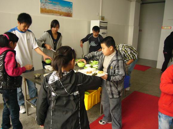 在志愿活动中,学员们都满怀激情。早上去的时候就热情的与食堂阿姨打招呼,进了食堂就开始热乎朝天的忙了起来。另外,在食堂中,学员们特别注意卫生,为的是保护孩子们的食品安全。