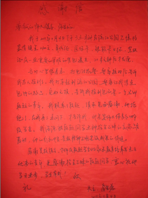 11月4日下午3时左右,段超同学路过滨江公园,在不远处的地上发现了一个背包,他捡起背包发现里面有现金2300元、身份证、医保卡、银联卡4张、驾驶证以及一些单据。段超觉得失主此时肯定会很着急,于是立即打电话报警,并且把这个包交给了警察。而失主李芝蓉女士在二十多分钟后才发现自己丢了背包,情急之下报了警,警察告诉他已经有人拾到了并放在派出所里,失主赶到后,经过核对包内的物品确定正是自己的丢失的背包,在李女士的再三询问下,得知捡到这个包的正是英国正版365官方网站08级运动训练的段超同学,而当失主请求当面感谢,被段超同学拒绝了,于是李女士送来了锦旗及感谢信表达对段超拾金不昧行为的感谢。