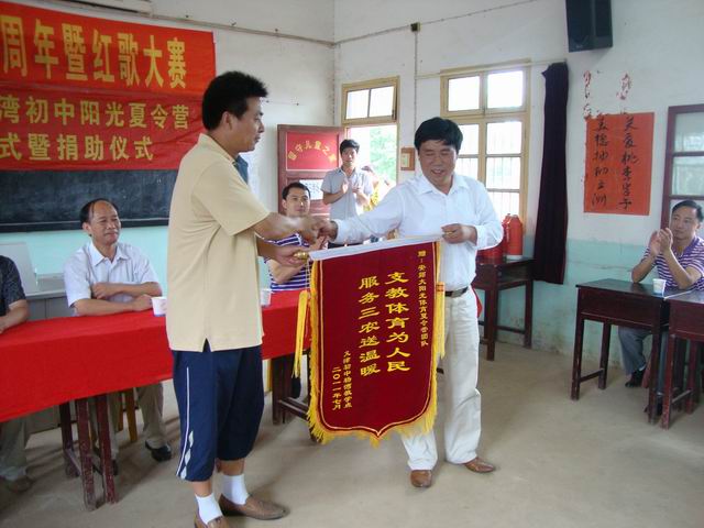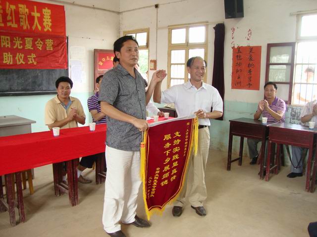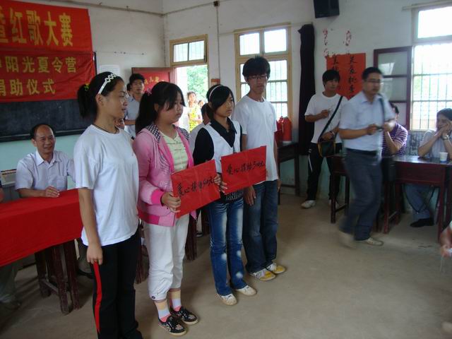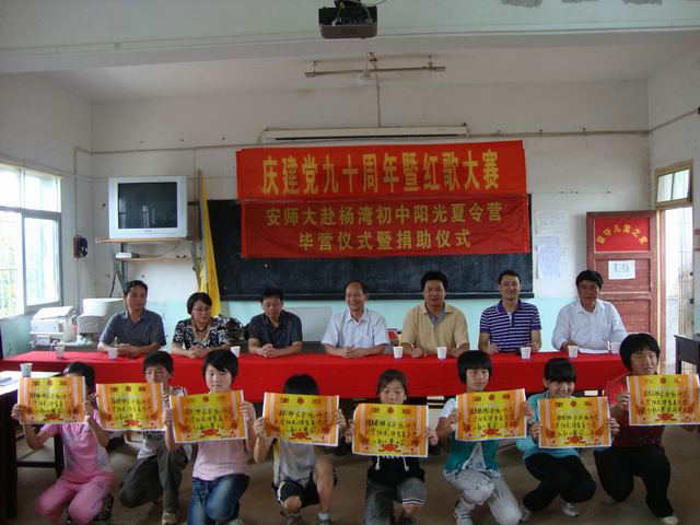 下午15时许,英国正版365官方网站赴枞阳杨湾中学“阳光体育”夏令营闭营仪式在义津中学杨湾教学点的多媒体教室举行。安师大公司党委书记贡植斌、公司党委副书记钟晨、枞阳县教育局副局长吴泳涛、枞阳县团委书记叶志娇、英国正版365官方网站团委书记黄德春、义津中学董事长王时芳等领导老师出席了闭营仪式。在闭营仪式之前,先举行的是由暑期社会实践团队队员组织举办的“庆祝建党九十周年”红歌大赛的颁奖仪式。仪式上贡植斌书记首先对给与暑期社会实践团队大力支持的枞阳县教育局、枞阳县团委和义津中学的领导老师表示了感谢,随后对英国正版365官方网站在历年开展暑期社会实践活动作了简单的介绍。并提出英国正版365官方网站团委和枞阳县团委共建的构想,加深英国正版365官方网站和枞阳县团委之间的联系和友谊,开展更广泛、更深入的合作,促进老员工了解社会,增长才干,健康成长。枞阳县教育局副局长吴泳涛在随后发言。他充分肯定了本次暑期社会实践的意义,对参加本次暑期社会实践的全体队员表示了亲切的慰问。同时,也表示对双方的合作前景看好。