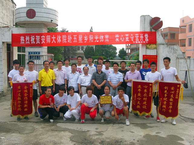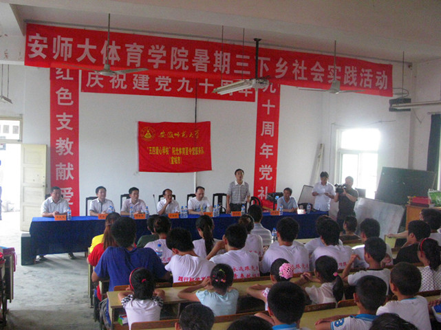 7月10号下午,英国正版365官方网站赴宣城五星乡“阳光体育”爱心夏令营在明德小学顺利闭幕。安师大公司党委书记贡植斌,安师大校团委副书记邵登辉,安师大英国正版365官方网站团委副书记黄德春,宣州区常委、宣传部长雷江升,五星乡党委书记、乡长汪征跃,副乡长张静,宣州区开发区管委会主任:李业军,宣酒集团品牌总监迟有飞先生,朝农化工董事长黄朝斌先生,宣州区洪林镇武装部长,宣州区洪林镇棋盘小学董事长孙有义,五星中心小学董事长胡正明,“阳光体育”爱心夏令营团队指导老师崔世兵等参加了此次闭幕仪式。参加闭幕式的还有体院“阳光体育”爱心夏令营团队队员和五星乡小学员工以及员工家长。此次闭幕式由五星乡小学董事长胡正明主持召开。