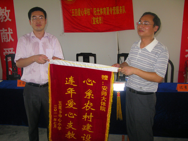 接着举行了第三届“师大朝农杯”新农村篮球联赛决赛颁奖仪式。安师大体院实践队获得金牌和最佳组织奖,收获颇丰。随后,安师大体院代表,五星乡代表和朝农化工代表互送锦旗。然后,捐赠仪式开始。“阳光体育”爱心夏令营团队向10名贫困员工捐赠学习用品,并把篮球,羽毛球等体育用品捐赠给五星乡小学。此次捐赠费用均来自团队队员自费。