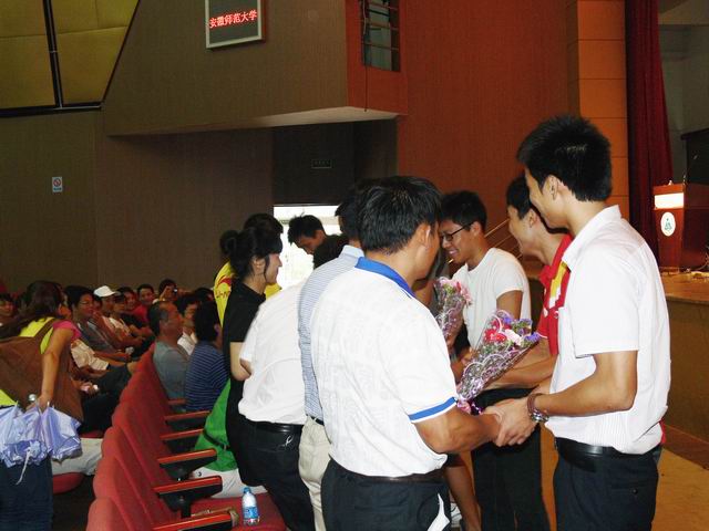随后,教师代表运动人体科学教研室主任黄徐根博士对即将离校的毕业生们送上了亲切慰问与深切祝福;非毕业班员工代表2008级体育教育专业钟婷婷同学向全体毕业生致欢送词;毕业生代表2007级体育教育专业蔡维敏同学致答谢词。毕业生代表还向教师代表敬献鲜花,表达了毕业生对恩师的一片感激之情。