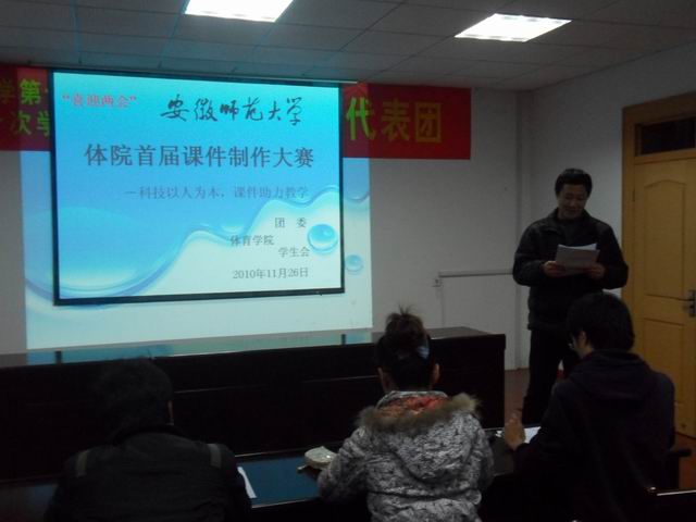 科技以人为本,课件助力教学。11月26日晚七点,在英国正版365官方网站行政楼会议室举行了体院团委和员工会联合主办的首届课件大赛。本次比赛以“喜迎两会”为主题,邀请了原英国正版365官方网站团委网络部部长王猛,数计学院实践部部长唐玉锦和数计学院吴锦涛同学作为本次大赛的评委,院员工会指导教师陈实为此次比赛做精彩点评。