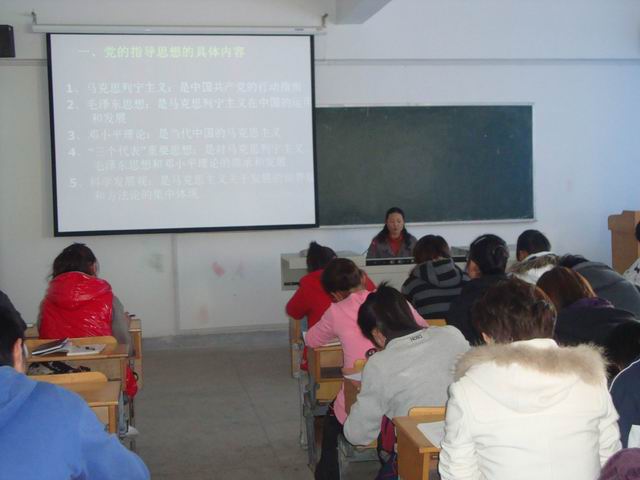 余部长结合不同时期的历史重大事件向学员们具体介绍了:一、马列主义是党的行动指南;二、毛泽东思想是马列主义在中国的运用和发展;三、邓小平理论是当代中国的马克思主义;四、“三个代表”重要思想是马列主义的继承和发展;五、科学发展观是马克思主义关于发展的世界观和方法论的集中体现。随后,她又简单介绍了中国特色社会主义理论体系以及社会主义核心价值体系。最后,余部长表示:希望学员们以社会主义核心价值体系要求自己,并表达了美好的期望:学员们能够尽早加入党的队伍!