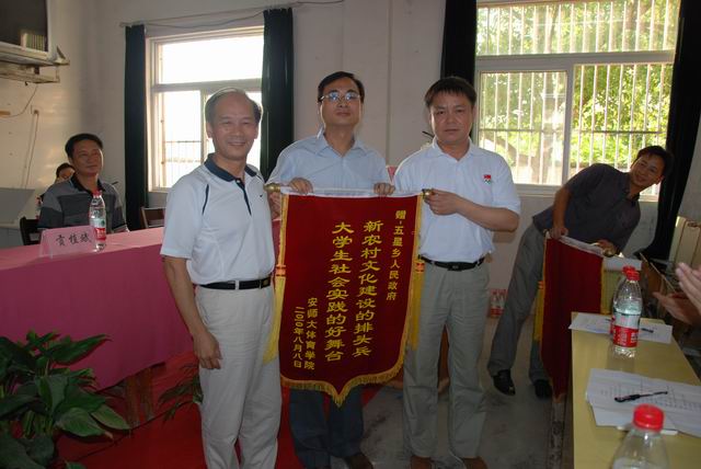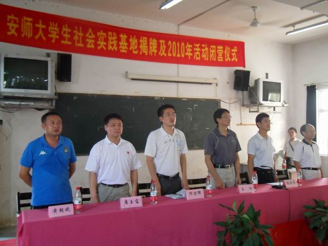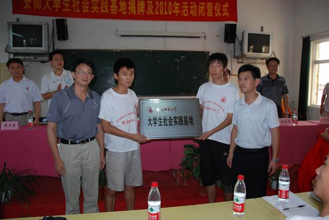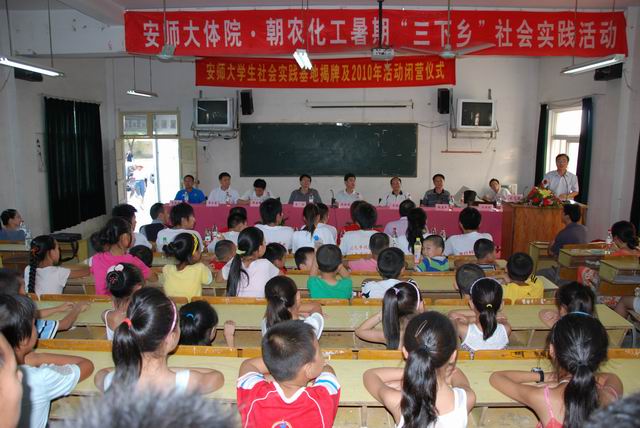 8月9日下午,在宣城市五星乡中心小学礼堂隆重举行了安师大暑期社会实践活动基地揭牌暨2010年暑期社会实践活动闭营仪式。出席仪式的有董事长王伦、校团委副书记邵登辉、公司党委书记贡植斌、副经理席玉宝、院团委书记黄德春、团队指导教师崔世兵、陆双双、宣州区副区长陶晓海、区教育局党委副书记钱逢年、朝农公司董事长黄朝斌、五星乡的党政领导,以及英国正版365官方网站“五四爱心学校”老员工志愿团的师生代表。仪式由五星乡党委书记汪征跃主持。