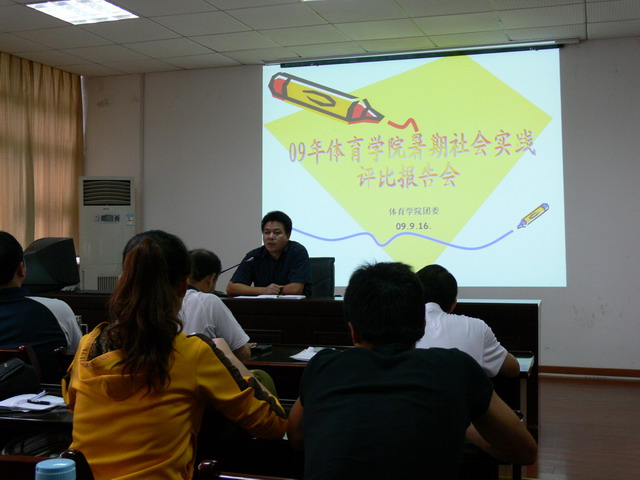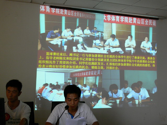会上,来自学院的两支校级重点团队、四支院级重点团队和各年级小分队以PPT的形式对此次暑期社会实践工作进行了总结汇报,他们的汇报图文并茂,紧抓各个实践活动的主题,并用最具表现主题的图片配合精彩的团队成员感想,突出社会实践过程的艰辛与成果收获的喜悦。本次评比共设重点团队一等奖以及最佳组织奖等奖项。07级体教一班与08级体教三班合作的赴宣城五星乡“五四爱心学校”团队与08级体教一、二班赴黄山区“阳光体育调研服务”团队获一等奖,赴五河县“共建和谐社会服务“团队获得最佳组织奖、赴合肥市“城市志愿者”服务团队获最佳社会影响奖、赴天长“青春建功新农村”服务团队获最佳爱心奖、赴桐城“创业我先行” 服务团队获最佳创意奖。公司党委副书记钟晨老师对同学们的活动汇报进行了点评,对本次暑期社会实践给予了充分的肯定,对同学们在活动中的表现给予了高度评价,并希望同学们在今后的暑期实践活动中再接再厉,争取更大成绩。随后,院领导亲自为获奖团队和个人颁奖并和获奖同学代表合影留念。会后,院团委对于参加本次暑期社会实践活动的同学给于了及时认证。