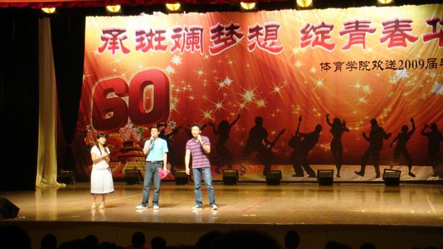 晚会以一首beyond的《真的爱你》拉开帷幕,这首经典的老歌瞬间将整个礼堂的气氛带动起来,接着是健美操《奔》将妩媚的印度舞与激情的现代健美操完美结合,使整个会场内人声鼎沸。体院雷震经理秀了一段口琴独奏,真诚的祝愿毕业生们前程似锦,赢得了台下雷动般的掌声。体院团委书记同时也是09届毕业生的辅导员黄德春老师也登台为毕业生们送上最真诚的祝福,与两名同学一起演唱那首《祝你一路顺风》,台下的毕业生们也手拉着手,随着音乐的旋律舞动着双手,此情此景感人至深许多人都留下了感动的泪水。劲爆的街舞,柔美的拉丁舞、研究生表演的《健身风暴》、T台秀以及第四届“春之声”舞蹈大赛一等奖和二等奖的舞蹈《中国妈妈》和《狼图腾》的表演让台下观众享受了一场视觉上的盛宴。由王云辰同学编排的话剧《千年等一回》幽默中不乏感动,舞蹈与武术相互穿插,古今中外经典音乐相结合,让人时而捧腹大笑时而感动落泪,将整场气氛带动至高潮。