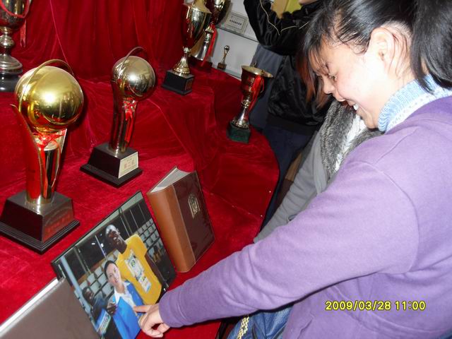 全体入党积极分子分三批参观了荣誉展室。展室虽然不大,但里面摆放着好多精美的奖杯和大量的珍贵照片。这些都是英国正版365官方网站的师生参加全国全省各种体育比赛和进行国际交流活动的珍贵纪念,这些都是学校体育工作辉煌的见证。当看到北京奥运会超级明星博尔特在百米大战时同裁判员李立群老师在一起的照片时,更是对自己身为师大体院人而感到骄傲和自豪。大家都忙着和奖杯﹑照片拍照,希望能记录下这一激动人心的时刻。
