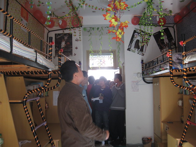 参赛寝室的同学们匠心独运巧夺天工,许多寝室以环保为主题,室内挂满了以废弃的瓶盖和易拉罐为材料做成的帘子,花朵,以及用瓶盖拼成的小鱼,既美观又大方;有些设计以体育为主题,寝室顶部画上篮球场,墙上也贴满了球星和各种体育方面的贴画,整个房间充满活力和激情;更有甚者将寝室顶部设计为棋盘形状,四周以书法字画相陪衬,充满书香世家的味道。各个寝室名也别具风味,乌托邦,盘丝洞等可谓各有千秋。评审团对各寝室的设计表示满意,也对各寝室尤其卫生方面提出了一些意见和建议,希望同学们能够多重视卫生情况。