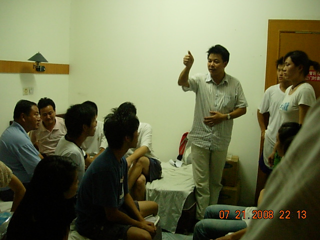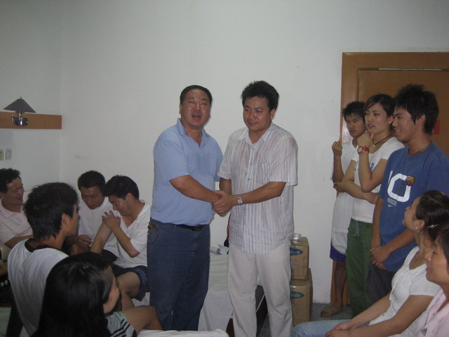 7月22日晚七点公司党委副书记钟晨与07体教一班辅导员陈实老师到达天长市并立即与天长市体育局办公室主任杨主任赶到公司重点团队队员们的住处看望队员们并进行工作上的指导。