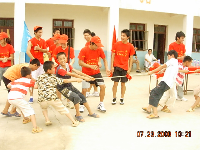 第一节课是志愿团的队员们为小同学们讲解和宣传奥运知识,让他们更多的了解奥运;接着是解决小员工们学习方面问题,由我们的志愿小老师一一解答所同学们提出的各个学习上的难题;而身为英国正版365官方网站的志愿者来说教孩子们体育运动是我们最拿手的也是必不可少的,篮球、排球、跳绳和拔河比赛各项运动也在石庙小学的操场上展开了。整个气氛看起来十分和谐融洽,每个人的脸上都洋溢着甜美的笑容。
