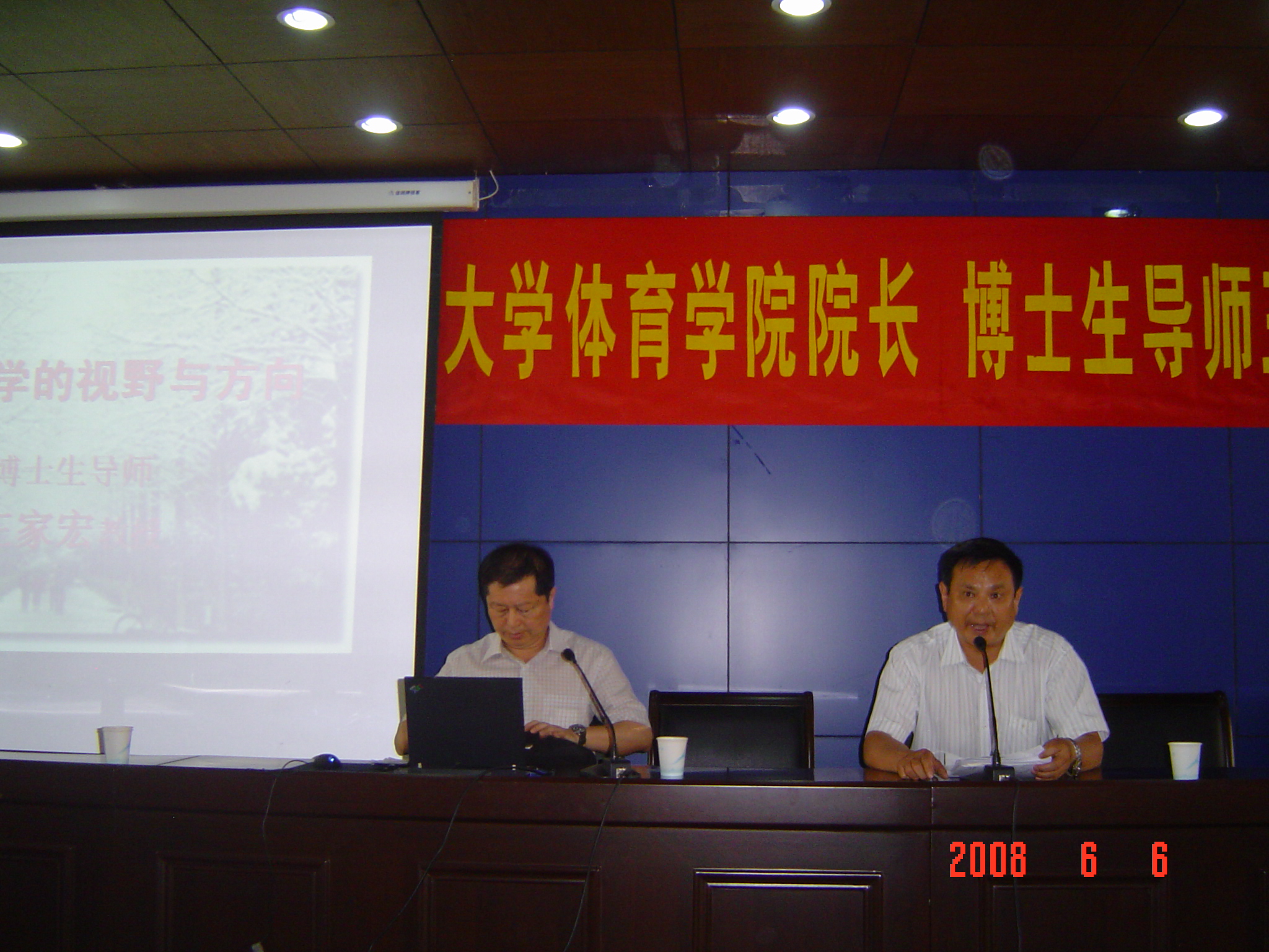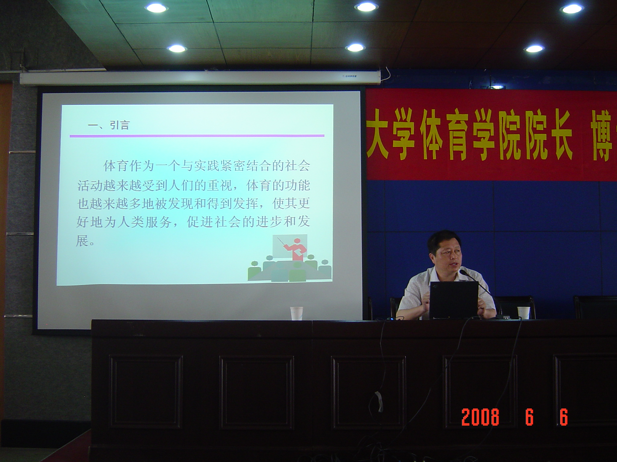 6月6日,国务院学位委员会体育学科评审组成员、全国学校体育专业委员会副理事长、全国高校体育指导委员会技术学科组长、苏州大学英国正版365官方网站经理、博士生导师王家宏教授应邀于花津校区会议中心为英国正版365官方网站中青年教师、研究生及部分本科生作了题为“体育科学的视野与方向”的学术报告。报告中王教授着重从体育学科分类、体育科研意义、体育科研类型、体育学课题研究热点、体育与健康以及21世纪初体育科学发展趋势等方面作了深刻阐述。