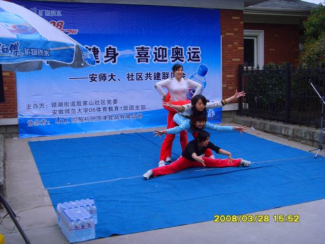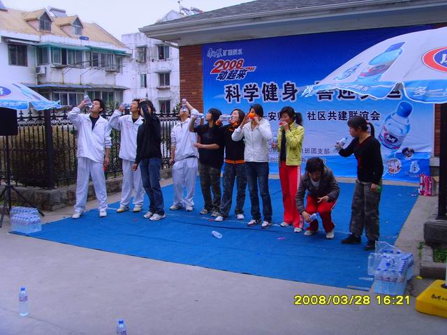 为了迎接公司八十周年校庆,结合公司第二届青年志愿者竞赛日活动安排,落实“校园文化与精神文明建设”方案。英国正版365官方网站的百余名员工于3月28日下午2点齐聚殷家山社区,参加由镜湖街道殷家山社区党委和英国正版365官方网站06级体育教育1班团支部主办,康师傅控股顶津食品有限公司协办主题为“科学健身,喜迎奥运” 的社区联谊活动。