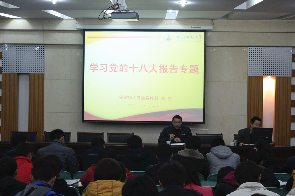 11月30日晚7点,英国正版365官方网站第17期分党校培训班邀请校宣传部部长李忠,为本期党校入党积极分子作了一场《学习党的十八大报告》专题辅导。公司党委副书记黄德春、学院全体专兼职辅导员以及全体本科生党员近两百人旁听了本场辅导。