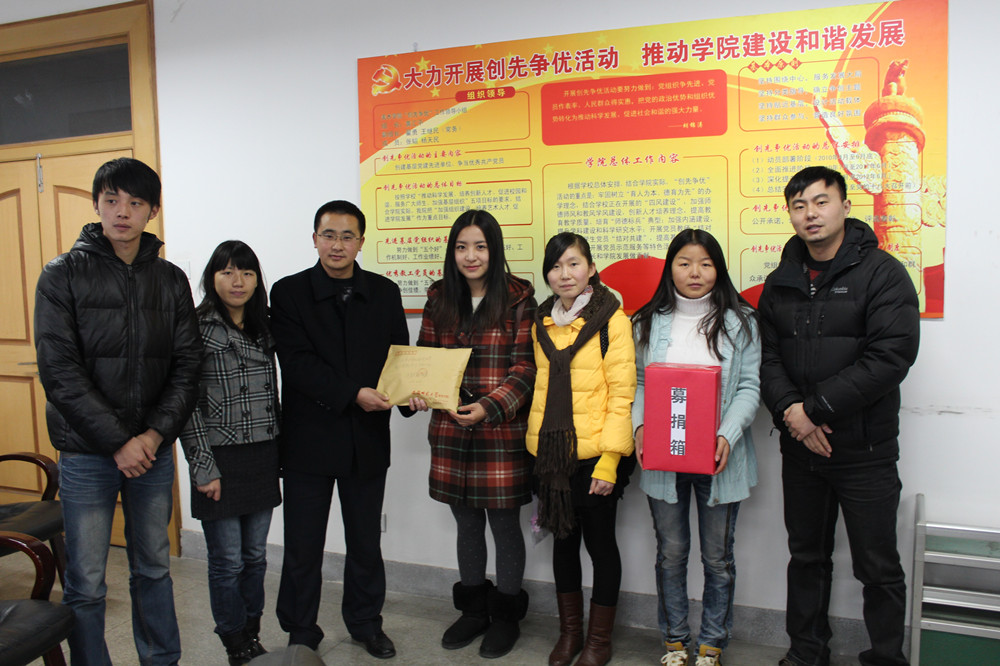 12月4日中午一点,英国正版365官方网站在院行政楼二楼圆形报告厅举办爱心捐款仪式,为不幸患白血病的美术学院2010级艺术设计专业的周琦同学募捐。院团委副书记仲飞主持募捐仪式,院员工会成员以及全院不同年级和专业的600余名同学参加了募捐仪式。