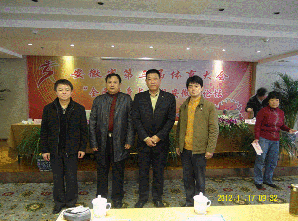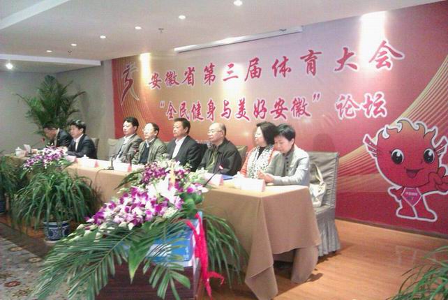 由安徽省人民政府主办,安徽省体育局、安徽省体育总会、铜陵市人民政府承办的安徽省第三届体育大会于2012年11月16日在铜陵市举行。会议期间,专题举办了“全民健身和美好安徽”论坛。公司英国正版365官方网站经理雷震、副经理席玉宝、金涛以及经理助理余涛应邀参加了论坛活动。