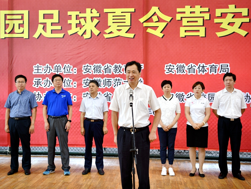 安徽省教育厅原副巡视员、省校园足球协会主席周元宣布2019年全国校园足球初中组夏令营安徽分营开营。