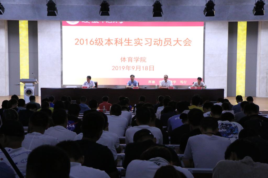 2019年学院新增社会体育指导与管理专业本科生实习,为更好的为员工提供实习岗位,在原有实习合作单位前提下,学院今年又先后与芜湖奥体产业园、中体体育商业运营管理江苏有限公司、爱尚动体育文化传播有限公司、圣歌艺术文化传媒有限公司等多家企业建立联系,并最终形成合作,为学院五个专业的员工提供了可选的实习岗位。结合2018年人才培养方案修订和专业评估等实际,学院规划设计实习方案,形成了“前期准备-校内指导-驻点实习-返校见习总结”四个模块的实习模式,提升了实习的实效性。并于9月18日组织召开了2016级本科生实习动员大会。向员工详细解读了实习工作方案,并遴选了25名教师为各实习组指导教师。