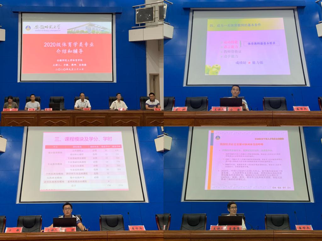 9月28日晚上7:00,英国正版365官方网站在图书馆报告厅和北侧田径场教室举行2020级新生专业介绍和辅导讲座,专业负责人方敏、周坤、宣海德、王结春、陈建霞分别介绍了体育教育、社会体育、休闲体育、运动训练、舞蹈表演五个专业的专业课程设置和学业要求,院领导崔世兵、余涛参会并为同学们提出希望和要求,2020级辅导员和部分专业教师也参加了上述活动。