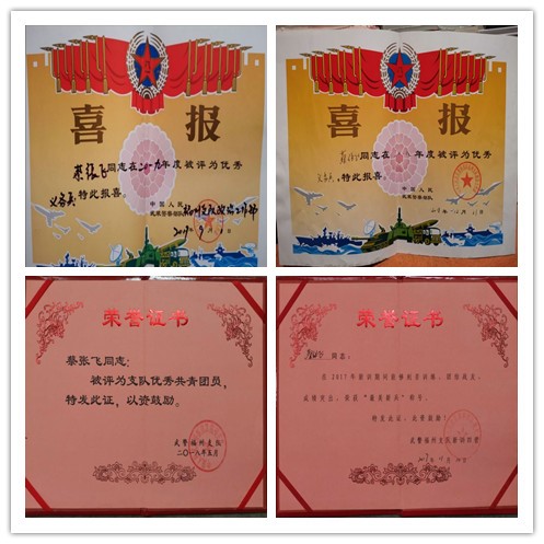 2018年和2019年:武警福州支队“优秀义务兵”(全票当选)。