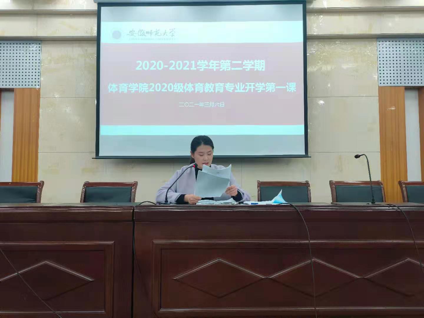 本网讯(英国正版365官方网站 董雅)2021年3月6日下午,英国正版365官方网站在财务处二楼报告厅举行新学期“开学第一课”公开课,公司党委副书记崔世兵及全体专兼职辅导员参加了2020级体育教育专业“开学第一课”主题班会,主题班会由辅导员朱克习主持。