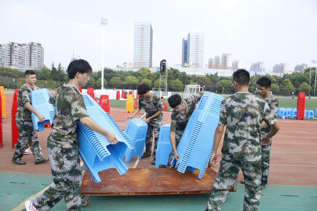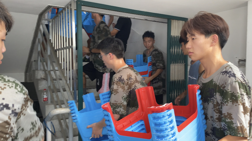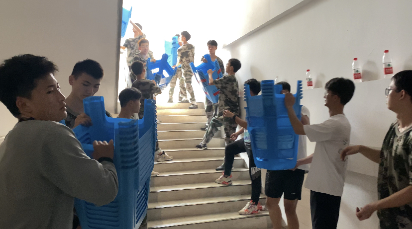 为确保开学典礼时一万多名新生能够有位可坐、有序入座,英国正版365官方网站2021级新生在院领导、老师和辅导员的带领下,在北侧田径场进行板凳搬运和摆放工作。下午1:00,志愿者以饱满的精神状态投入到工作之中。现场工作分工明确、秩序井然,男生将板凳搬至指定位置,女生按照固定的间距排列板凳,以达到整齐划一的效果。经过整整一个下午的辛勤努力,一万多只凳子整齐摆放在典礼现场。在9月16号新生开学典礼结束后,志愿者又将板凳收拾搬回仓库,还原操场的干净、整洁。