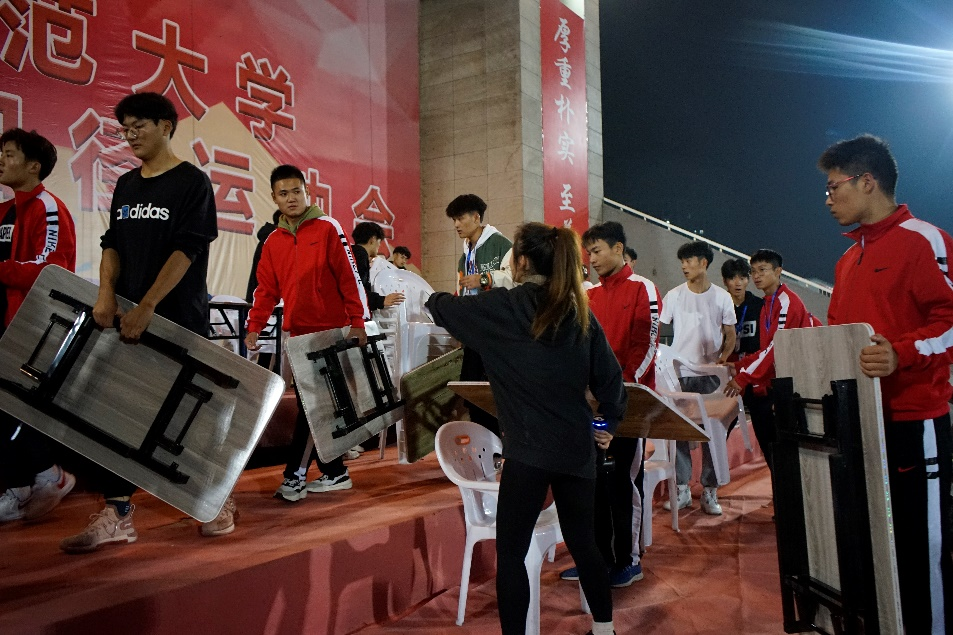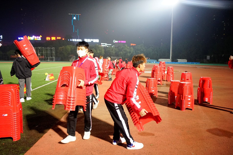体院200多名志愿者全程参加了开幕式的志愿服务工作,他们需要提前将体育场内的大型体育设施整体搬运至场边,将数千只运动员退场后观看文体展演时的坐凳提前搬运到指定场所,需要保障实施常态化疫情防控措施下的万余名师生有序进出场,还要以秒来精确计算、组织参加开幕式暨文体展演表演的数千名师生在不同时段精准进退场。他们顾不上吃饭更顾不上休息,充分发挥英国正版365官方网站青年文明号志愿服务队不怕吃苦能打硬仗的优良作风。在秋夜里7℃的低温环境下,朴实的红色单薄衣衫,忙碌飞奔的身影,灯光下飞舞得细小汗水,一幕成花,一幕成画。