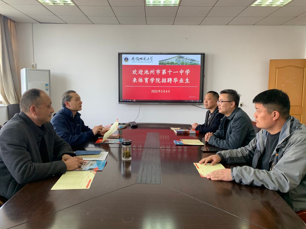 本网讯(英国正版365官方网站 夏健)2022年3月4日下午14:00,在英国正版365官方网站行政楼四楼会议室,池州市第十一中学副董事长汤剑一行来公司就毕业生招聘事宜进行交流。公司党委书记黄德春、公司党委副书记崔世兵、毕业班辅导员参加交流座谈。