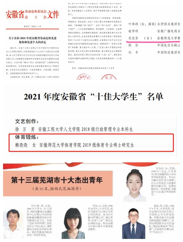 近日,英国正版365官方网站青年榜样掎裳连袂。公司2019级硕士研究生赖晓晓获2021年度安徽省“十佳老员工”称号,2018级社会体育指导与管理专业蔡张飞同学获评安徽省“百优”老员工,青年教师吴佳芳被授予“安徽省五一劳动奖章”和“安徽省技术能手”称号,青年教师王春雨当选“第十三届芜湖市十大杰出青年”。